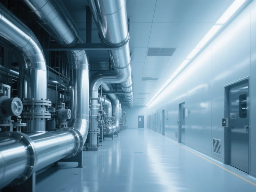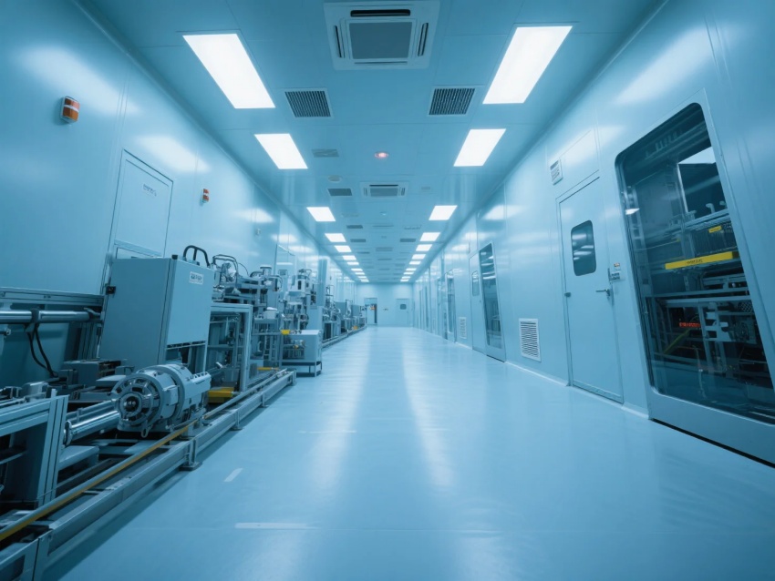 本方案嚴格遵循ISO6級(千級)潔凈標準,采用模塊化潔凈室結(jié)構(gòu),以灰白色調(diào)為主,搭配防靜電高架地板與金屬壁板,打造高精度半導(dǎo)體生產(chǎn)環(huán)境。