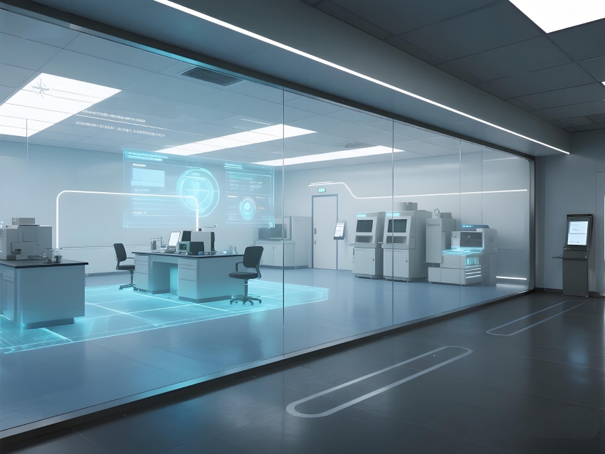 本實驗室宛如一座精密運轉的"環境圣殿",以"絕對環境控制"為靈魂信條。冰川藍與鈦白灰的漸變墻面如同極地冰原與金屬穹頂的完美交融,嵌入式監測屏上躍動的翡翠綠數據流,恰似未來之泉在科技殿堂中潺潺流淌。圓弧形玻璃隔斷如同透明的生物繭房,百級潔凈層流罩在其中吐納著純凈氣流。地面鋪設的防靜電陶瓷鋼板閃爍著冷冽光澤,接縫處的LED指示燈如同守衛環境標準的哨兵。銀色保溫管道與藍色冷媒管在設備區交織出工業交響曲,智能除濕機組半透明的外殼里,冷凝過程正在上演一場液態芭蕾。數據中控室270°曲面屏上,懸浮粒子濃度化作璀璨星云流轉。整個空間以幾何的嚴謹與流體的靈動共舞,在科研的圣殿里譜寫出一曲星際交響詩。
