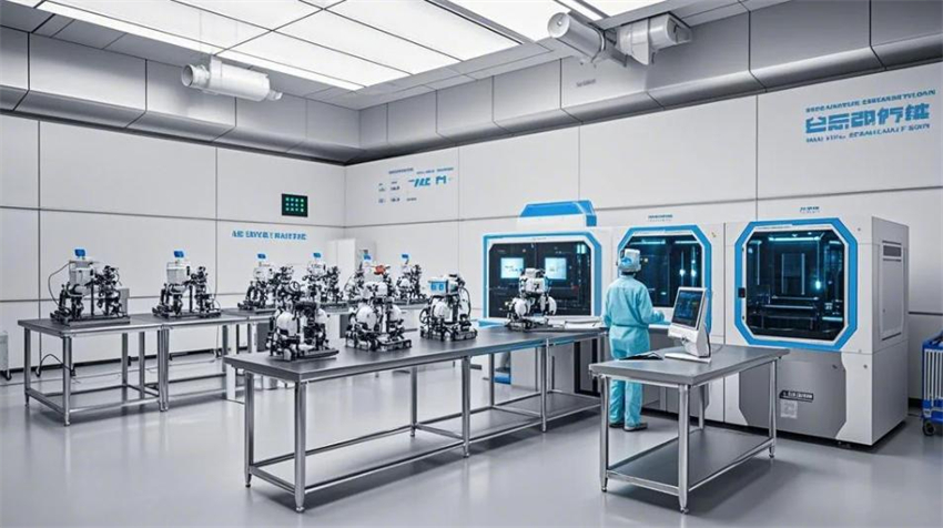 機(jī)械人研發(fā)實(shí)驗(yàn)室,未來科技風(fēng)格。實(shí)驗(yàn)室分為研發(fā)區(qū)、測試區(qū)、裝配區(qū)和辦公區(qū)。研發(fā)區(qū)占50%,測試區(qū)占30%,裝配區(qū)占10%,辦公區(qū)占10%。研發(fā)區(qū):防靜電環(huán)氧地坪(淺灰色),
