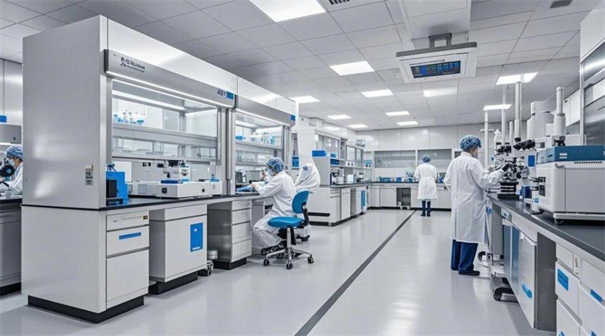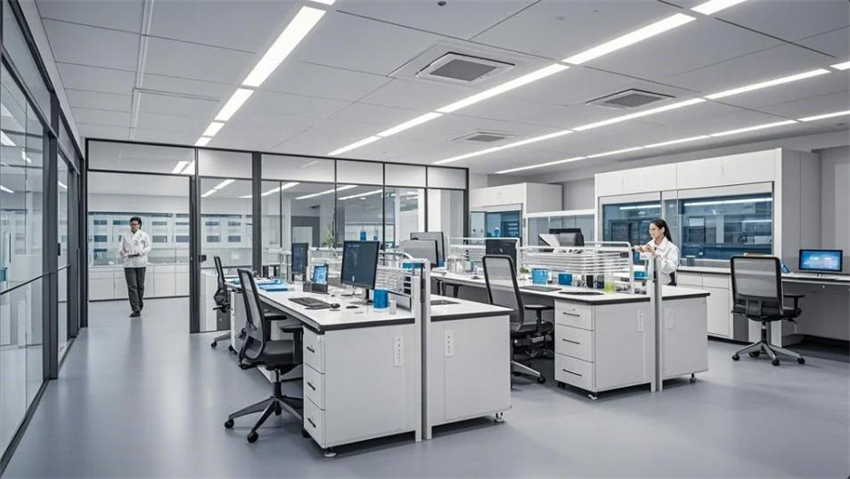 1000平方米生物實(shí)驗(yàn)室整體裝修,現(xiàn)代科技風(fēng)格,實(shí)驗(yàn)室分為核心實(shí)驗(yàn)區(qū)、設(shè)備區(qū)、樣品存儲(chǔ)區(qū)和辦公區(qū)。核心實(shí)驗(yàn)區(qū)占50%,設(shè)備區(qū)占30%,樣品存儲(chǔ)區(qū)占10%,辦公區(qū)占10%。核心實(shí)驗(yàn)區(qū):防靜電環(huán)氧地坪(淺灰色),白色彩鋼板墻面和天花板,頂部高效過濾器(HEPA),不銹鋼實(shí)驗(yàn)臺(tái),設(shè)備排列整齊。設(shè)備區(qū):精密儀器整齊排列,地面為防靜電PVC地板(淺色)。樣品存儲(chǔ)區(qū):冷藏柜和樣品架整齊,溫濕度控制。辦公區(qū):玻璃隔斷,現(xiàn)代簡約辦公桌。整體色彩:白色、淺灰色、科技藍(lán)點(diǎn)綴。